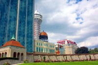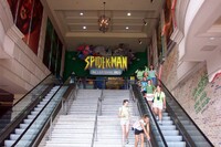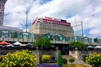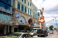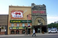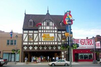 The Guru Indian Restaurant on the right ; statue of Henri Rechatin walking the tightrope from the Museum to the Casino Niagara property, a similar statue existed in the 1970s when the Wax Museum was on Clifton Hill ;