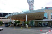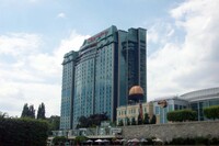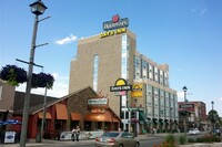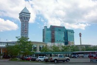 From left to right, Marriot Hotel, Konica Minolta Tower, Embassy Suites Hotel, Niagara Fallsview Casino Resort, Renaissance Hotel and the Skylon Tower ; Ontario Power Generating Station (OPG) bottom right ;
