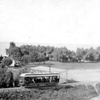 - An Electric Streetcar travelling through Lakeside Park in Port Dalhousie, Lake Ontario in the background
