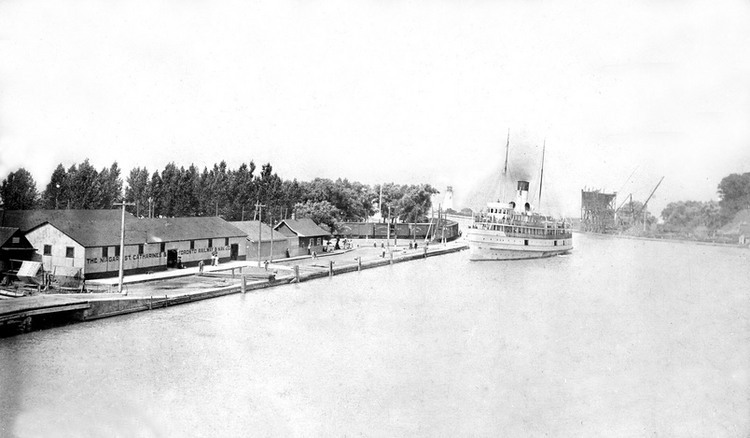 Steam Ship passing the NS&T Railway Station in Port Dalhousie