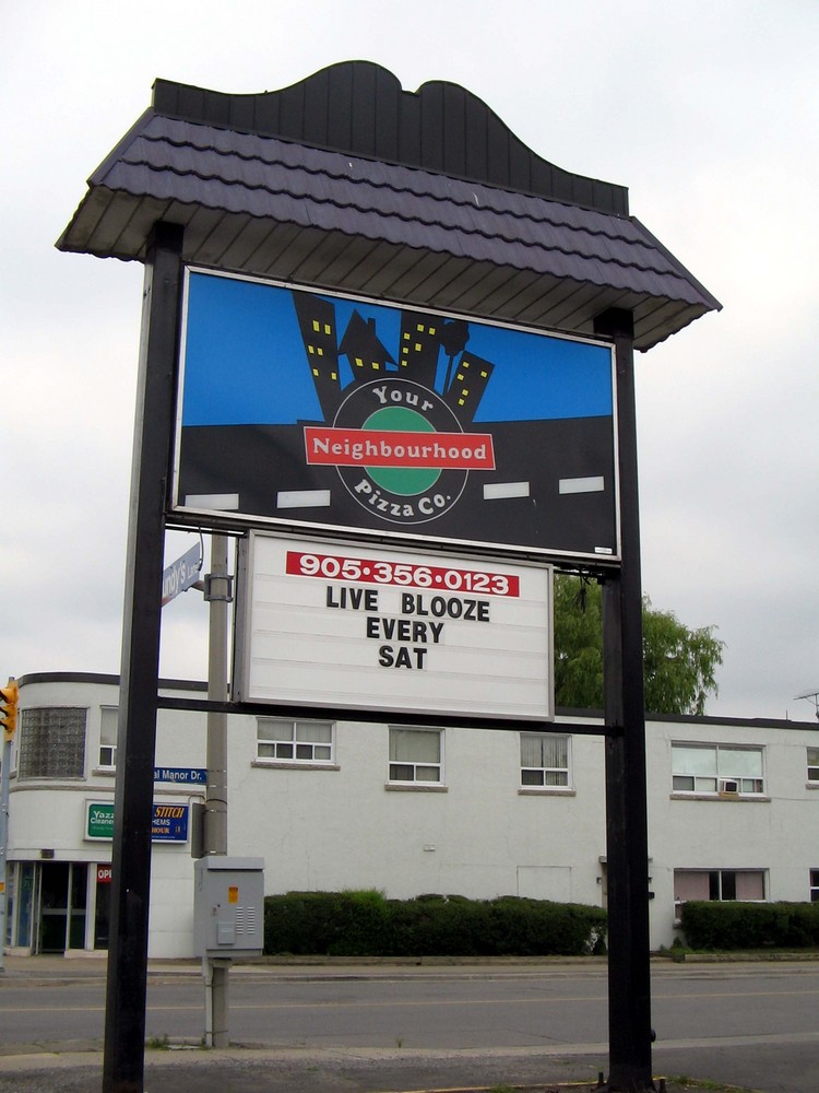 Lundy's Lane, 7241 - Neighbour's Restaurant - Your Neighbourhood Pizza and Pasta Eatery advertising sign