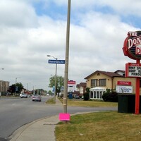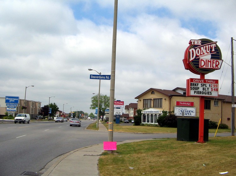 - Roadway Inn and Alpine Motel on the left ; the Donut Diner and Thriftlodge Flamingo Motel on the right ;