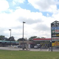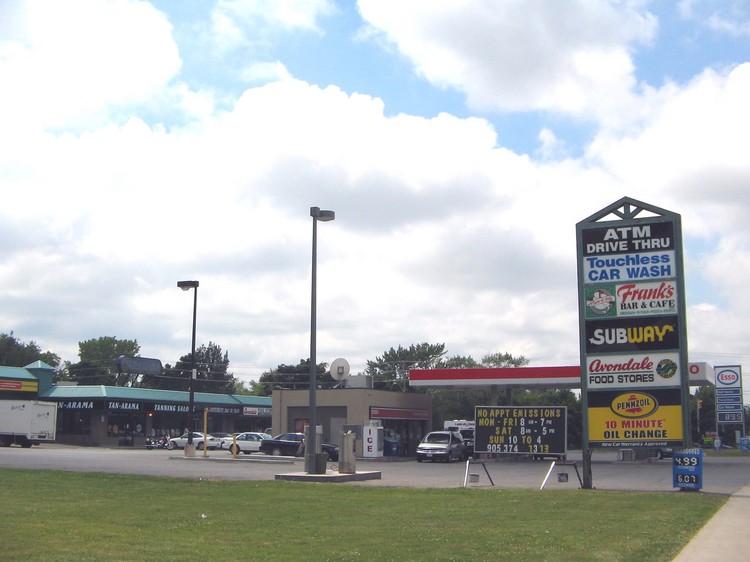 - From left to right, Tan-Arama Tanning Salon and Esso gas station ;