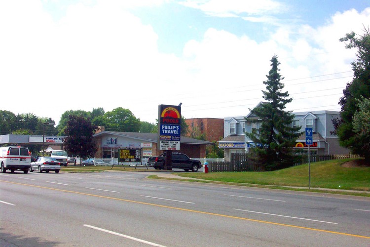 Thorold Stone Road - Dream Cars Sales and Autoservice, Oxford Learning Centre, Philip's Travel Agency and Malibu Pools store