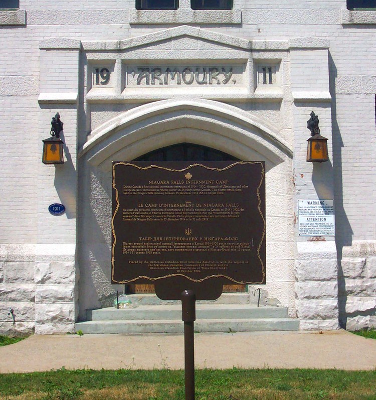 - Armoury Street and Victoria Avenue - Niagara Falls Armoury - front door and Niagara Falls Internement Camp plaque