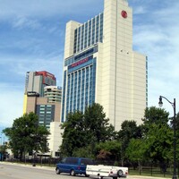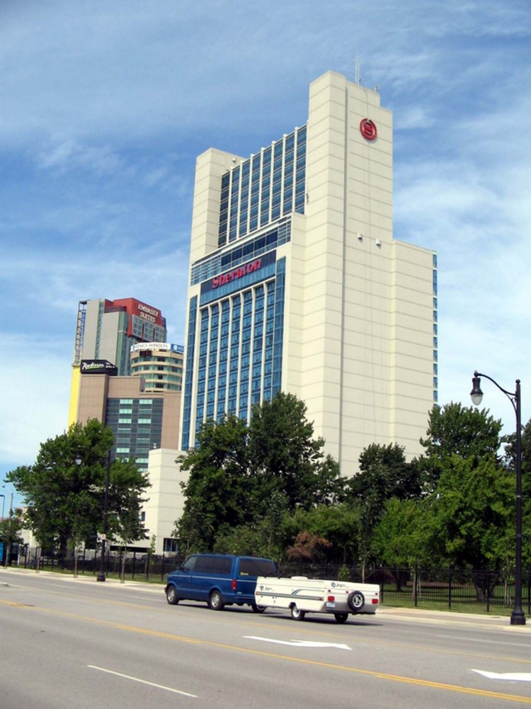 - From left to right, Embassy Suites Hotel, Konica Minolta Tower, Radisson Hotel and Sheraton Fallsview Hotel ;