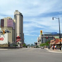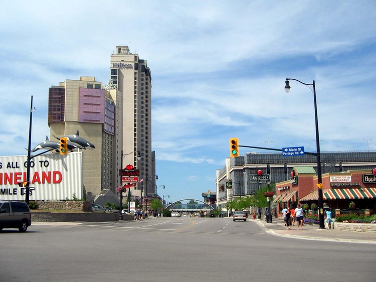 - Niagara Falls Hilton Hotel, Renaissance Fallsview Hotel, Vinny's Restaurant and Marineland advertisement sign on the left ; Niagara Fallsview Casino Resort and Applebee's Restaurant on the right ;