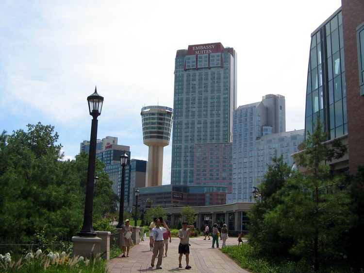 - From left to right, Sheraton Fallsview Hotel, Marriot Hotel, Konica Minolta Tower, Embassy Suites Hotel and Niagara Fallsview Casino Resort ;