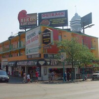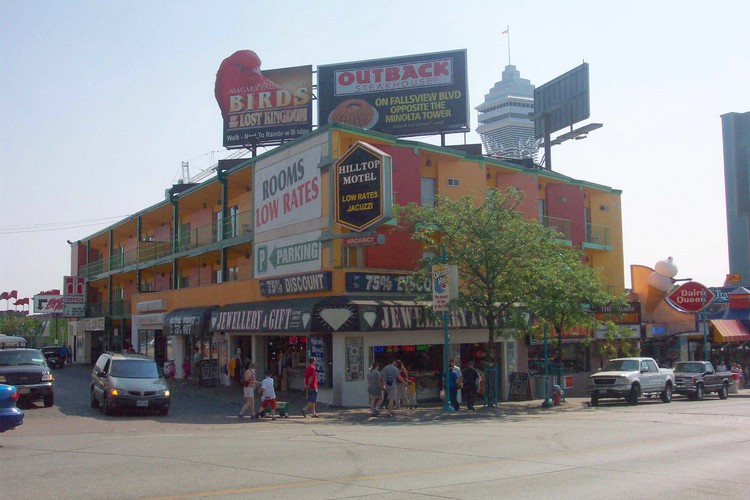 - Mystery Maze on the far left ; The Pilgrim restaurant and Dairy Queen Ice cream on the right ; Sheraton on the Falls Hotel on the far right ; Casino Niagara Tower visible in the background ;