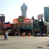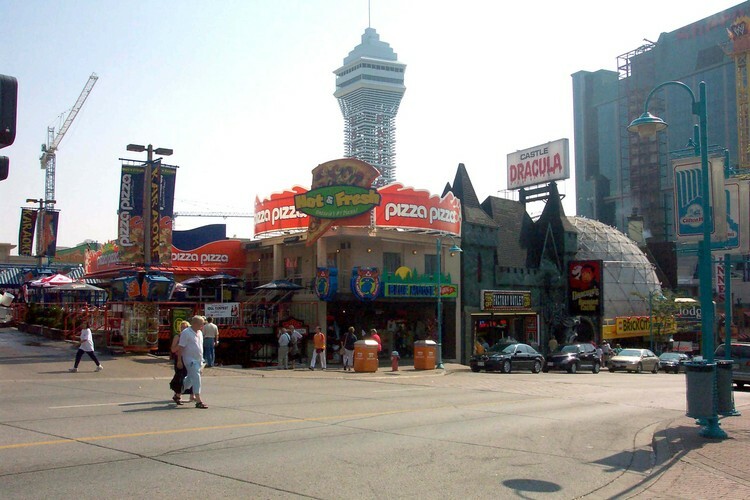 - From left to right, Pizza Pizza Restaurant and Karaoke, Blue Moose Trading Company souvenir store, Factory Outlet souvenir store, Castle Dracula haunted house and Brick City Lego Blocks museum ; Sheraton on the Falls Hotel visible on the far right ; Casino Niagara Tower visible in the background ;