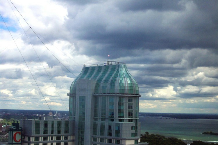 - en-CA These photographs were taken from the Blue Martini Lounge on the 35th floor at the Niagara Falls Hilton Hotel located at 6361 Fallsview Boulevard ; Jay Cochrane spent the summer of 2005 skywalking from the Niagara Falls Hilton Hotel to the Fallsview Casino Resort and also from the Fallsview Casino Resort to the Skylon Tower ;
