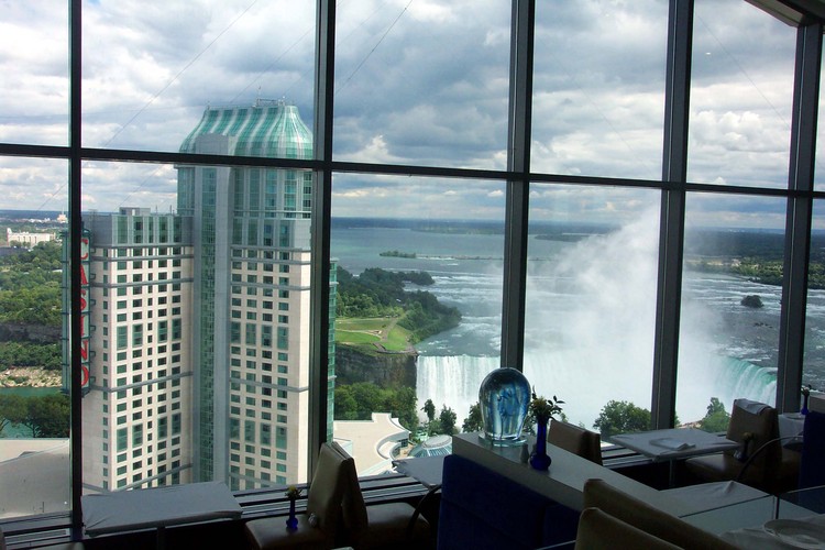 - Niagara Fallsview Casino Resort, the Upper Niagara River and the Horseshoe Falls visible through the window ;