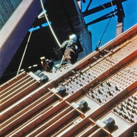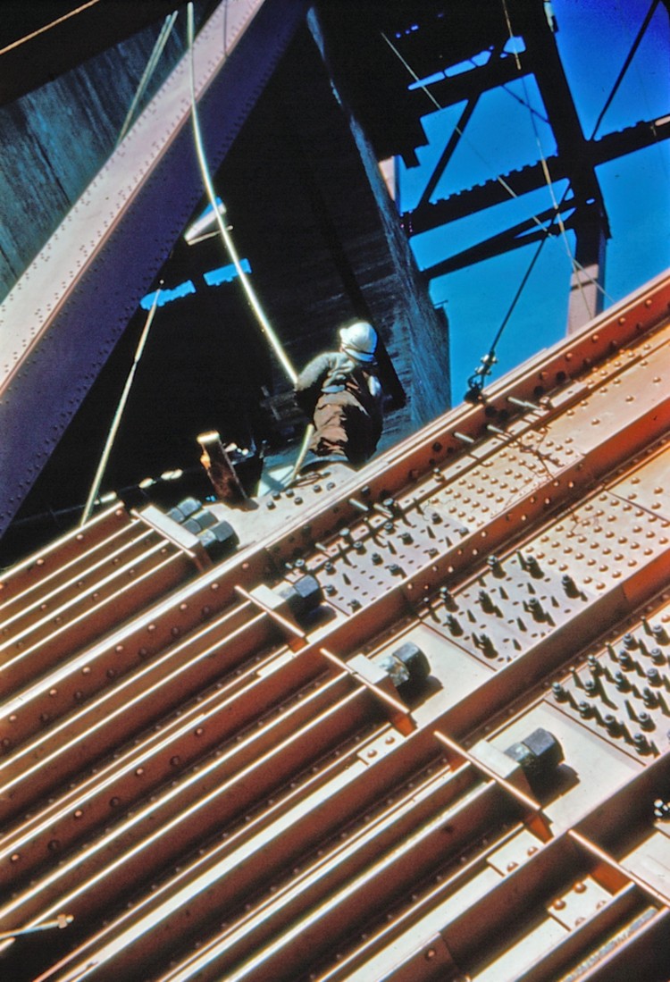 - Construction of the Rainbow Bridge - workers high above ground in the bridge supports