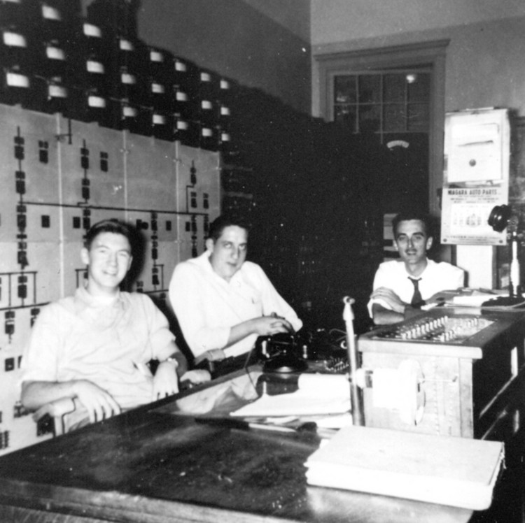 Ron Yorke, Jack Hodges and Bill Gough in the control room of the Toronto Power Plant