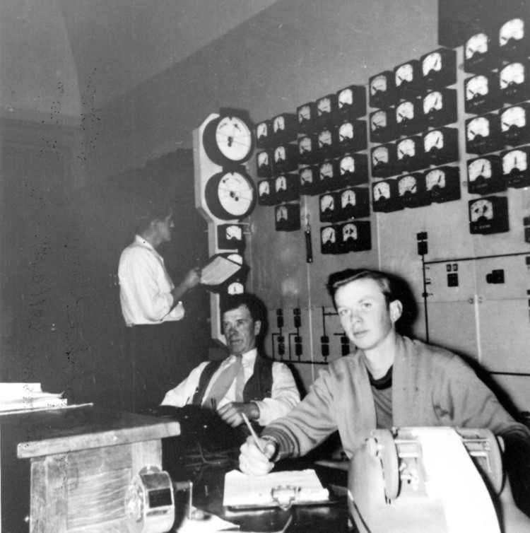 Jack Hodges, Erle Glennie and Henry Badger in the control room of the Toronto Power Plant