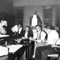 Ron Yorke, Bill Gough, Victor Fraser, Erle Glennie and Jack Hodges in the control room of the Toronto Power Plant