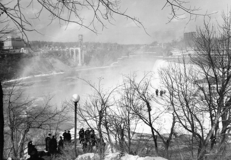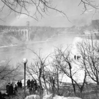 - Framework of Rainbow Bridge construction and Hotel General Brock in background