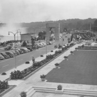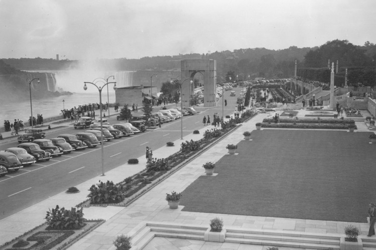 - Oakes Garden Theatre and cars parked along the Niagara Parkway