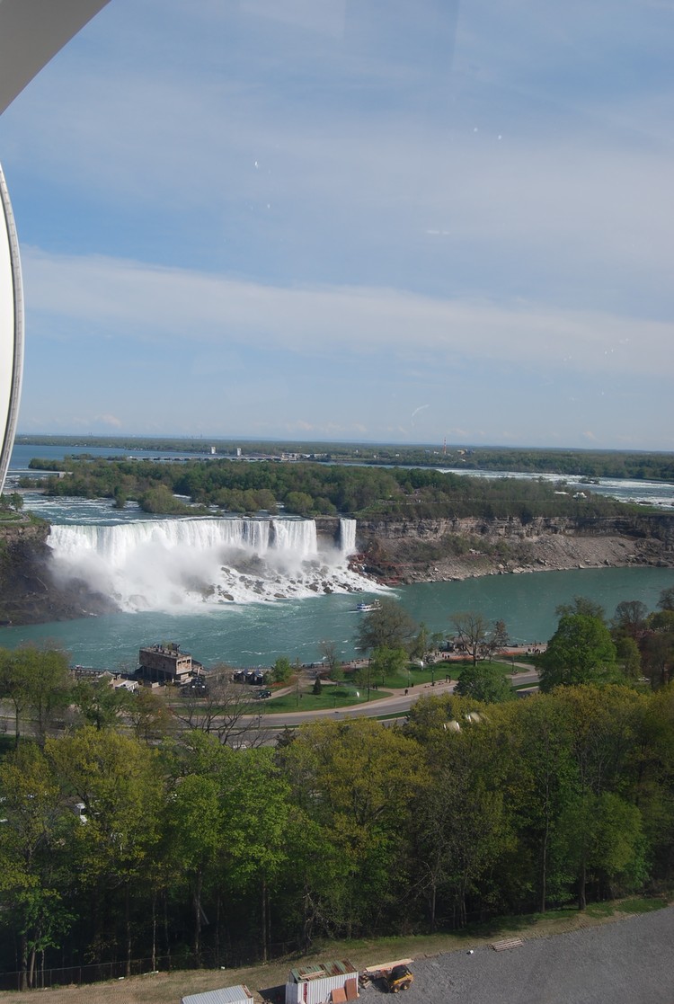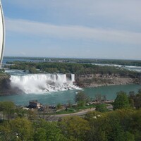 - View from the large ferris wheel (known as the Sky wheel) ; American Falls ; upper Niagara River (left) ; International Control Dam in the extreme background ; and the Niagara Gorge and River in foreground ; Queen Victoria Park and the Niagara Parkway in foreground ; observation station (bottom left); the spa and part of the ferris wheel carriage partially visible left ; taken at 5:00 pm ;