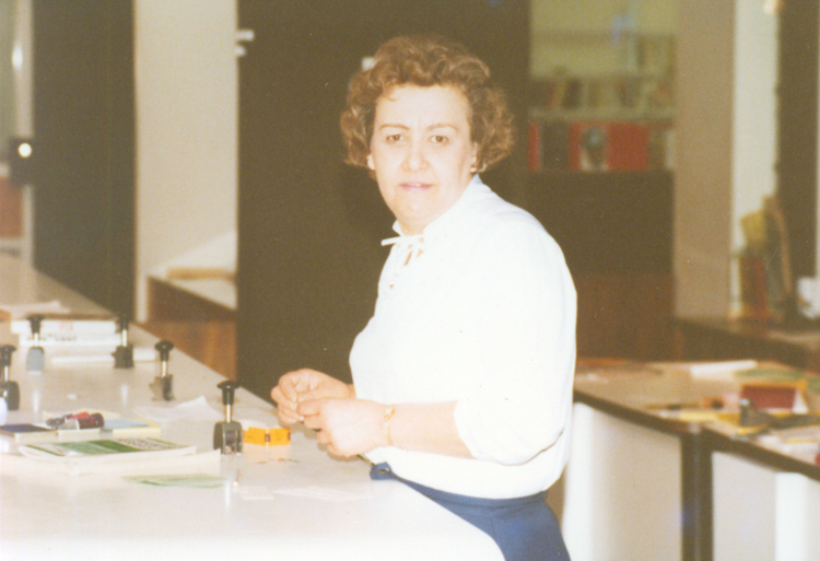 - Circulation Supervisor Connie Dick at the main circulation desk at the Victoria Avenue location ;