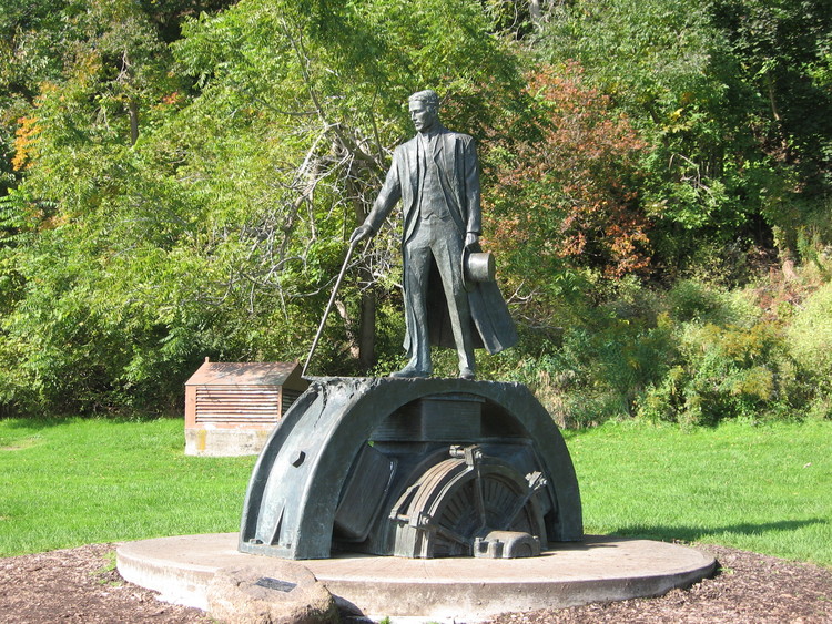 - en-CA Nikola Tesla statue and plaque in Queen Victoria Park. Plaque reads " Nikola Tesla Inventor 1856-1943. The Saint George Serbian Orthodox Church Niagara Falls in partnership with the Niagara Parks Commission have erected this monument to Nikola Tesla. Physicist, inventor, electrical engineer Tesla developed the world's first hydroelectric power system used here at Niagara Falls".