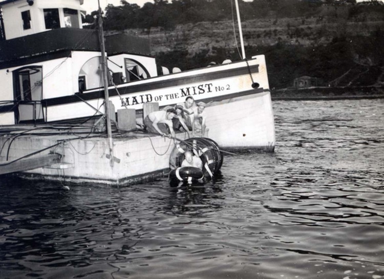 en-CA William "Red" Hill Junior in the "Thing" in the lower Niagara River by the Maid of the Mist boat No.2 and dock. He later died on August 5, 1951 after going over the Horseshoe Falls.