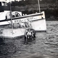 William "Red" Hill Junior in the "Thing" in the lower Niagara River by the Maid of the Mist boat and dock.