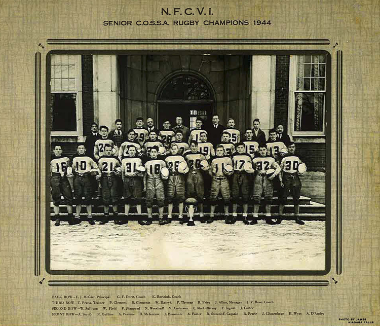 - en-CA The Niagara Falls Collegiate Vocational Institute Senior Rugby (Football) team won the 1944 Niagara District Championship by defeating teams from Fort Erie, Welland, Port Colborne, St. Catharines, and Stamford. This Championship entitled N.F.C.V.I. to play for the Central Ontario Secondary School Athletic title of their sport. In November of that year, they went to the University of Toronto in search of victory at this level. Despite cold weather and playing on a frozen field, the Niagara Falls boys played an outstanding game, and were victorious against a tough, determined team from Peterborough, Ontario. Coach Teddy Morris of the Toronto Argonauts, from the Canadian Professional Football League, attended the Championship game. Teddy was so impressed with the ability of the Niagara Falls place kicker, that he extended him an offer to try out with the Argonauts. The N.F.C.V.I. team won the C.O.S.S.A. Championship trophy, and were proud to bring it back to their school.