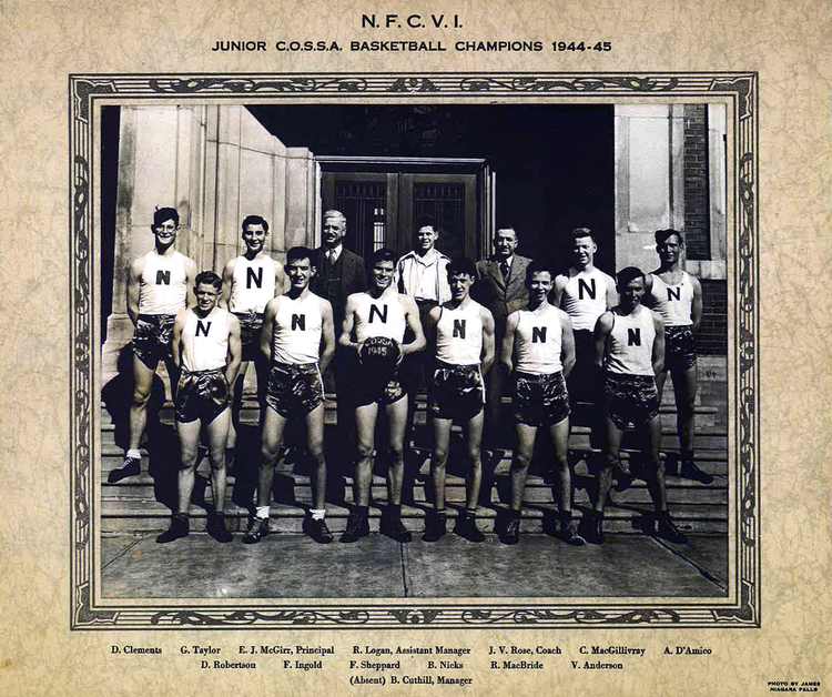 - en-CA The 1945 N.F.C.V.I. Junior Boys Basketball Team played against Welland, Port Colborne, Fort Erie, Stamford, Merritton and St. Catharines High Schools and went undefeated in their regular season schedule. At the time, it was the final year of World War II and due to war restraints, the team’s court was a concrete floor. However, under the coaching of Jimmy Rose, the team played winning basketball and defeated much larger schools to win the Zone Championship. At the C.O.S.S.A. Championships, the team played in the University of Toronto gymnasium. The N.F.C.V.I. team defeated Orillia in semi-final play, and in the finals, they went on to beat a Kingston High School team to become the 1945 C.O.S.S.A. Champions.
