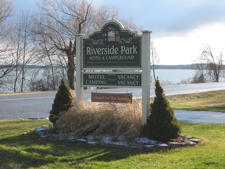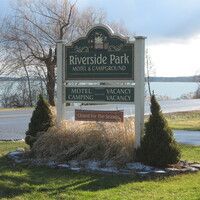 - en-CA Riverside Park Motel & Campground sign with the upper Niagara River in the background.