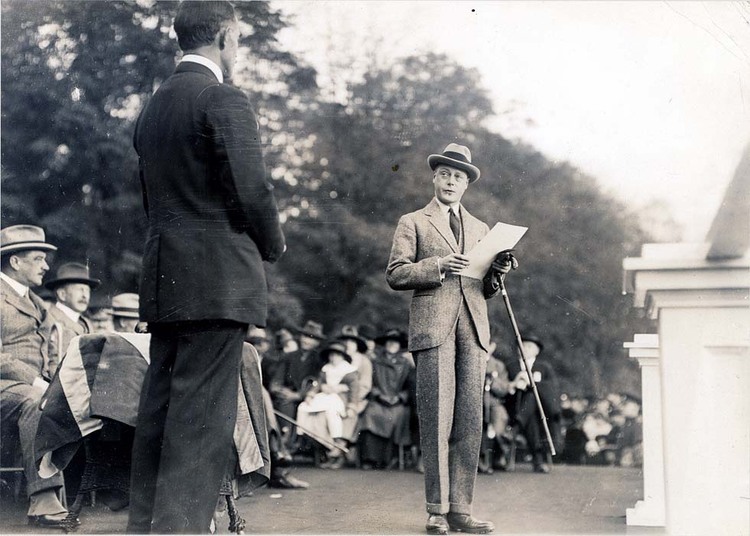 en-CA Prince Edward, Prince of Wales (future Edward VIII and Duke of Windsor) on royal tour of Canada in 1919 visits Niagara Falls. Prince Edward is giving a speech.