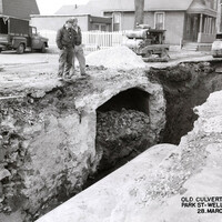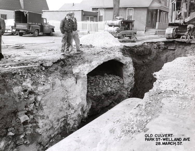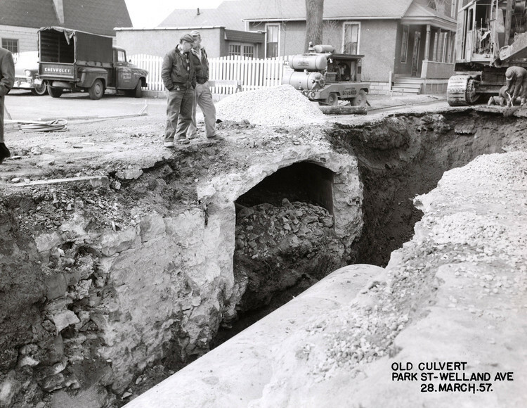 - en-CA Sewer construction along Park St. and Welland Ave showing an old culvert.