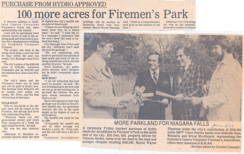 - en-CA June 4, 1979. Stamford Centre Volunteer Firemen's Park / Ontario Hydro / Price, Stan City Manager / Dilts, Don Alderman / MacBain, Al Alderman / Rodman, Ward Public Works director / Thomson, Wayne mayor / Dee, Bill / Kerrio, Vince MPP / MacKenzie, Brian