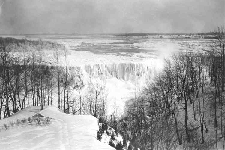 en-CA A small part of the Horseshoe Falls appears to have been frozen. The main Horseshoe part of the Falls however is still flowing. Goat Island is to the left in the photo.
