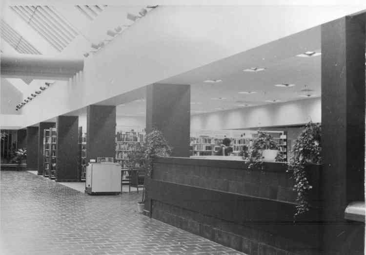 - en-CA Victoria Avenue Library. Looking down the main walkway towards the stacks. Two copies of photo.