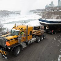 - en-CA A Pioneer Heavy Haul transport truck delivering the hull of a new Hornblower Niagara Cruises boat. The frozen lower Niagara River, Horseshoe Falls and hotels are visible in the background.