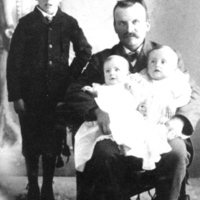 - en-CA James Harold Bacon (boy standing), baby on the left is John, the one on the right is Samuel Henry Clark (Harry) and the father is Abraham Bacon who is buried in the Stamford Presbyterian cemetery.