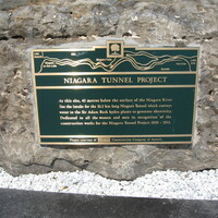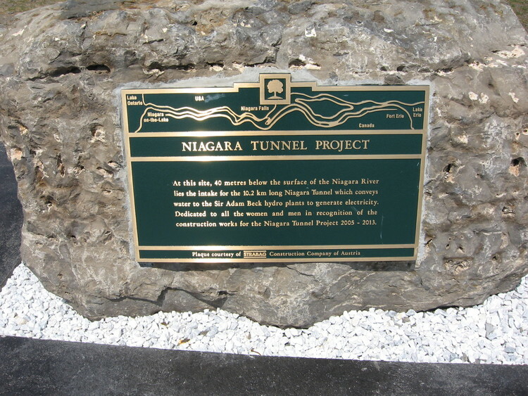 - en-CA Niagara Tunnel Project plaque. “At this site, 40 metres below the Niagara River lies the intake for the 10.2 km long Niagara Tunnel which conveys water to the Sir Adam Beck hydro plants to generate electricity. Dedicated to all the women and men in recognition of the construction works for the Niagara Tunnel Project 2005-2013.”