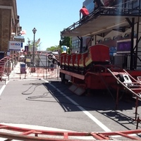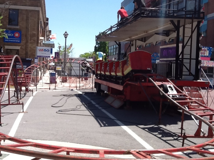- en-CA Dragon Express roller coaster at the intersection of Ontario Avenue and Queen Street. BMO building is in the background.
