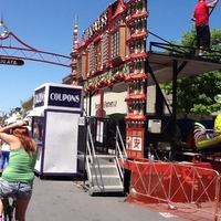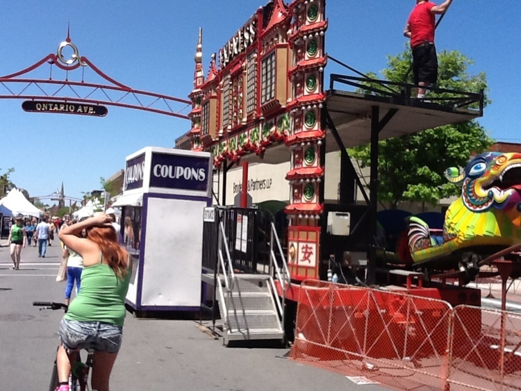 - en-CA Coupon booth in front of the Dragon Express roller coaster at the intersection of Ontario Avenue and Queen Street. Broderick & Partners LLP, 4625 Ontario Avenue is in the background.