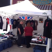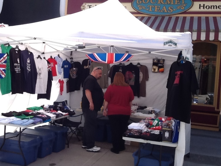 - en-CA British souvenirs for sale in a tent in front of Cranberry Creek gift shop on Queen Street.
