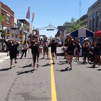 - en-CA Dancers in front of the Happy Feet dance studio on Queen Street.