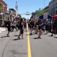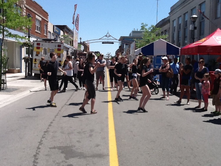 - en-CA Dancers in front of the Happy Feet dance studio on Queen Street.