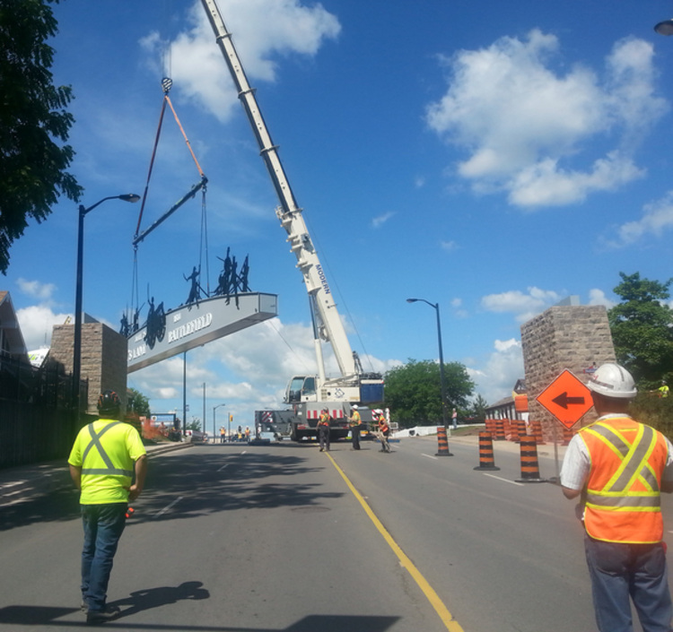 Lundy's Lane Archway Installation - Lifting the Sign - Far, 05