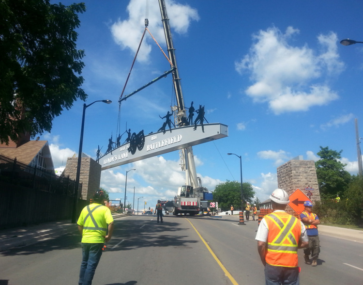 Lundy's Lane Archway Installation - Aligning the Sign - Far, 01