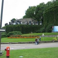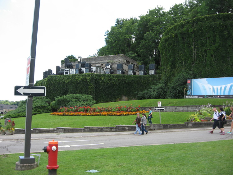 - en-CA Tourists walking along Niagara Parkway with the building that houses the lights that illuminate the falls in the background.