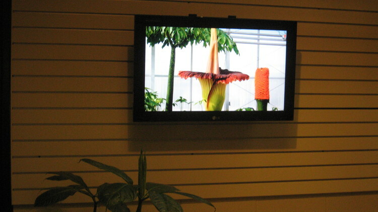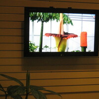 - en-CA Titan arum display on screen in the lobby of the Floral Showhouse.