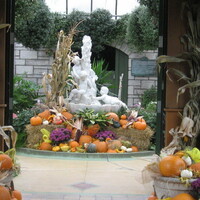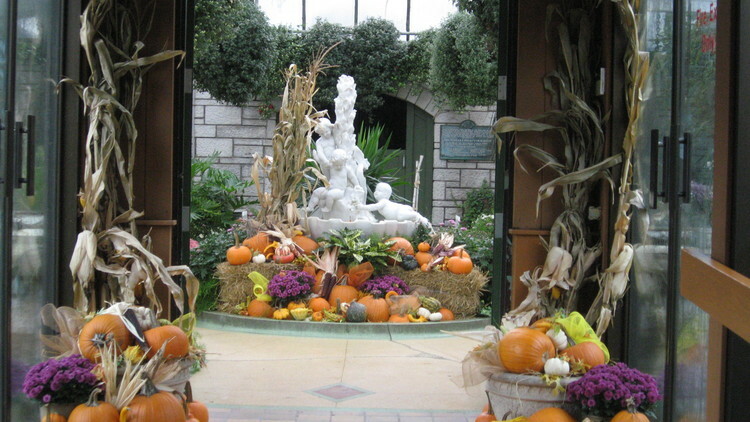 - en-CA Autumn display in the interior of the Floral Showhouse in front of the fountain.