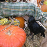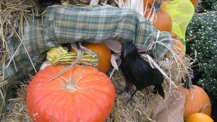 - en-CA Autumn display in one of the interior greenhouses of the Floral Showhouse featuring a scarecrow and blackbird.