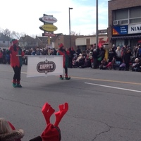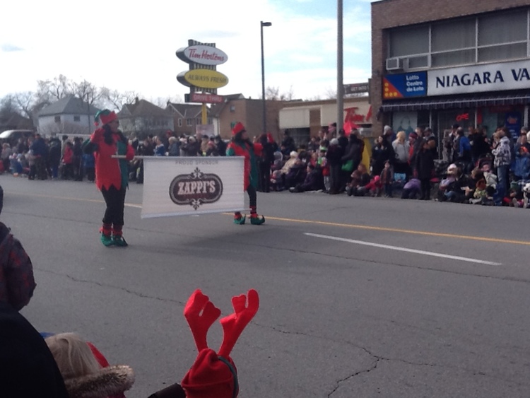 - en-CA Two elves holding a "Zappis" sign in the Santa Claus Parade, taken from in front of the Niagara Falls Public Library on Victoria Ave.